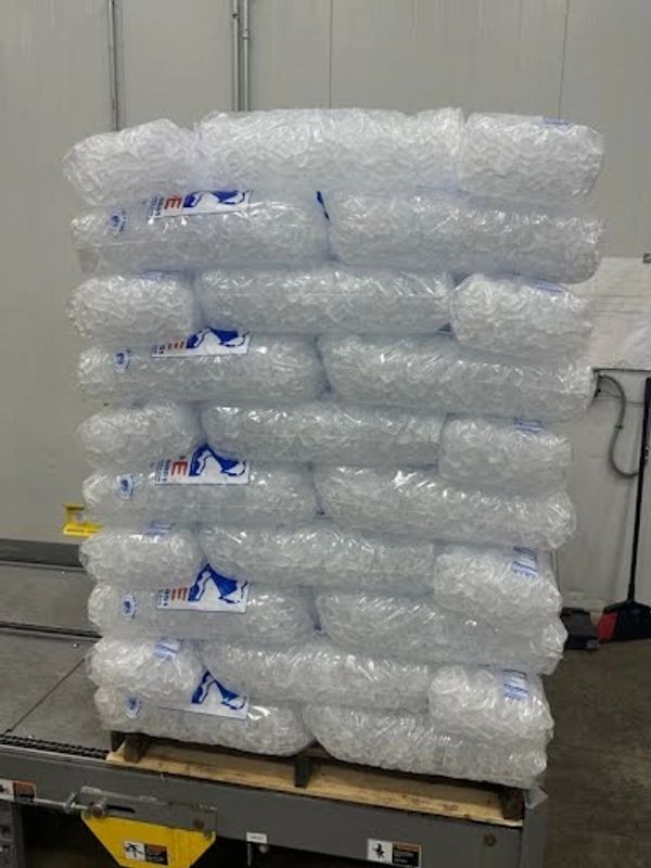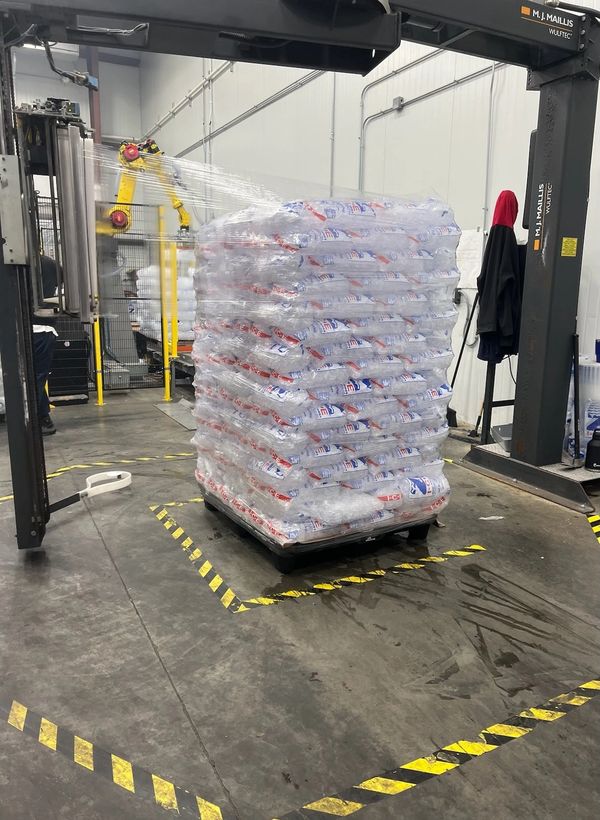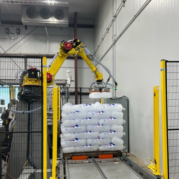 Watch a video showing our team and robot working in our plant to palletize ice!